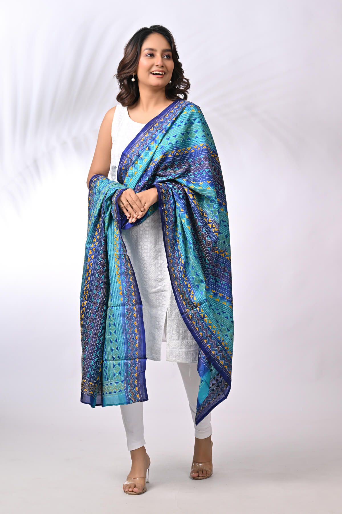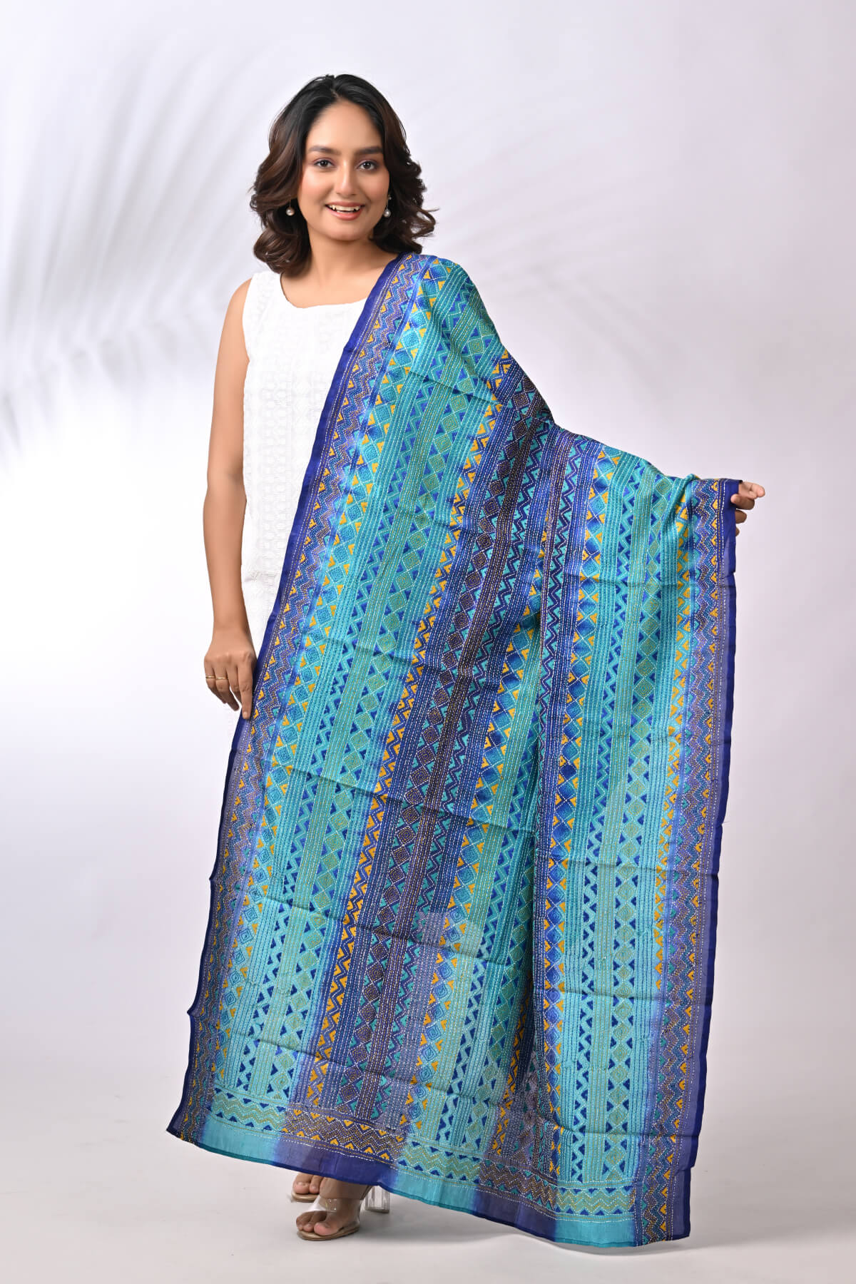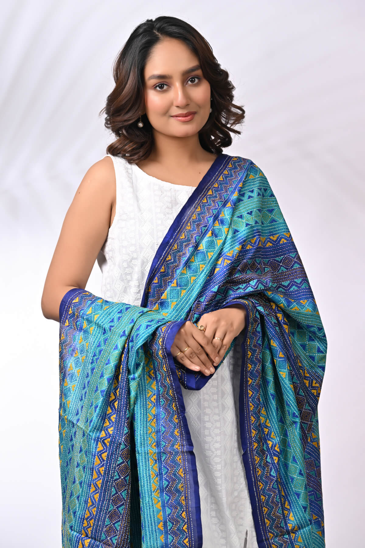 Dark Blue & Sky Blue Geometrical Silk Kantha Dupatta